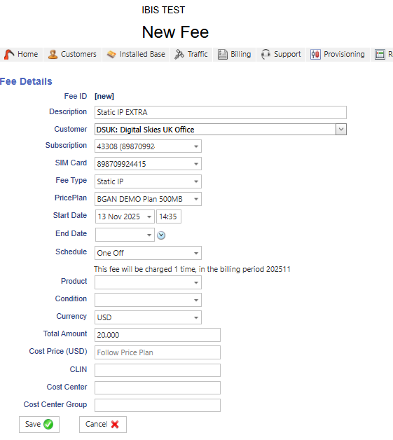 3. Enter the fee details. The Total Amount is entered manually or in case of a VAS fee, it will populate automatically from the price plan VAS fees, see Value Added Service Fees