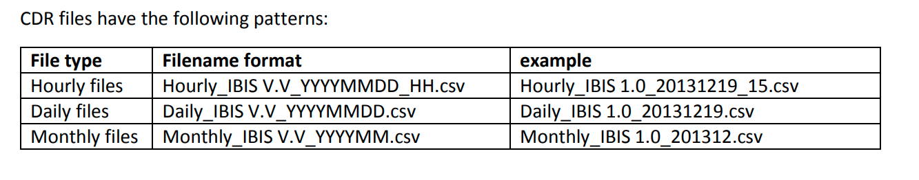 - The date and hour indicated in the filename indicate the day and hour in which the CDR was rated, not to be confused with the day or time when the call was made.