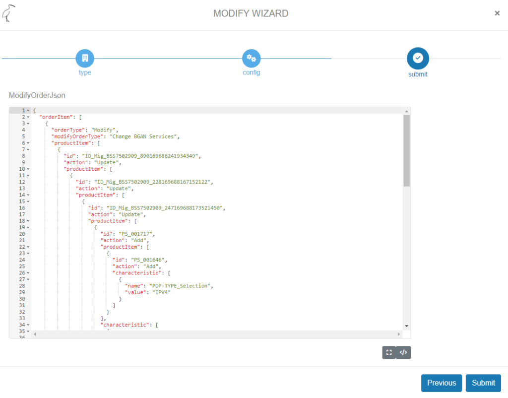The following page shows the order script as it will be sent through the API. Select Submit. in the below example BGAN IP Voice has been added. This page is for information only, the order can’t be modified here.