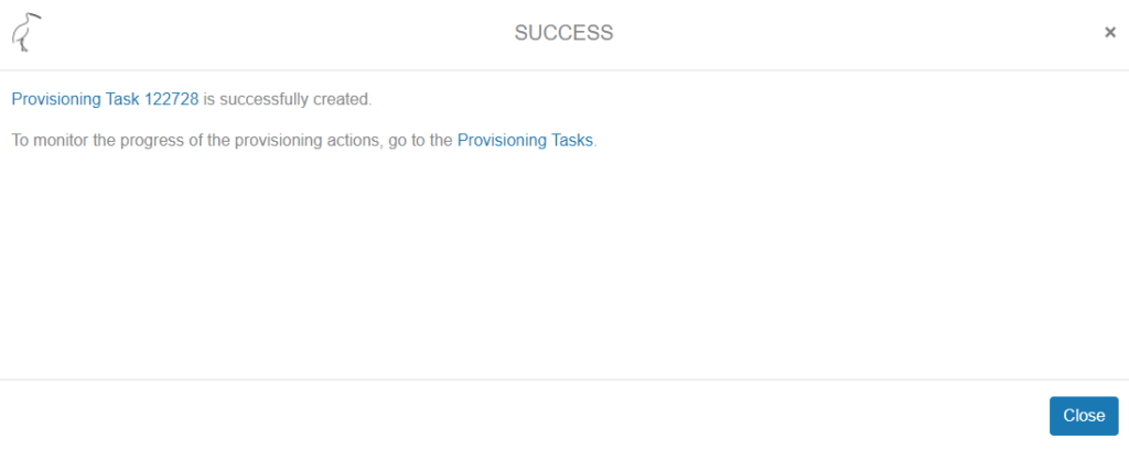 The provisioning task is created and the order process can be followed in the Provisioning Tasks overview.