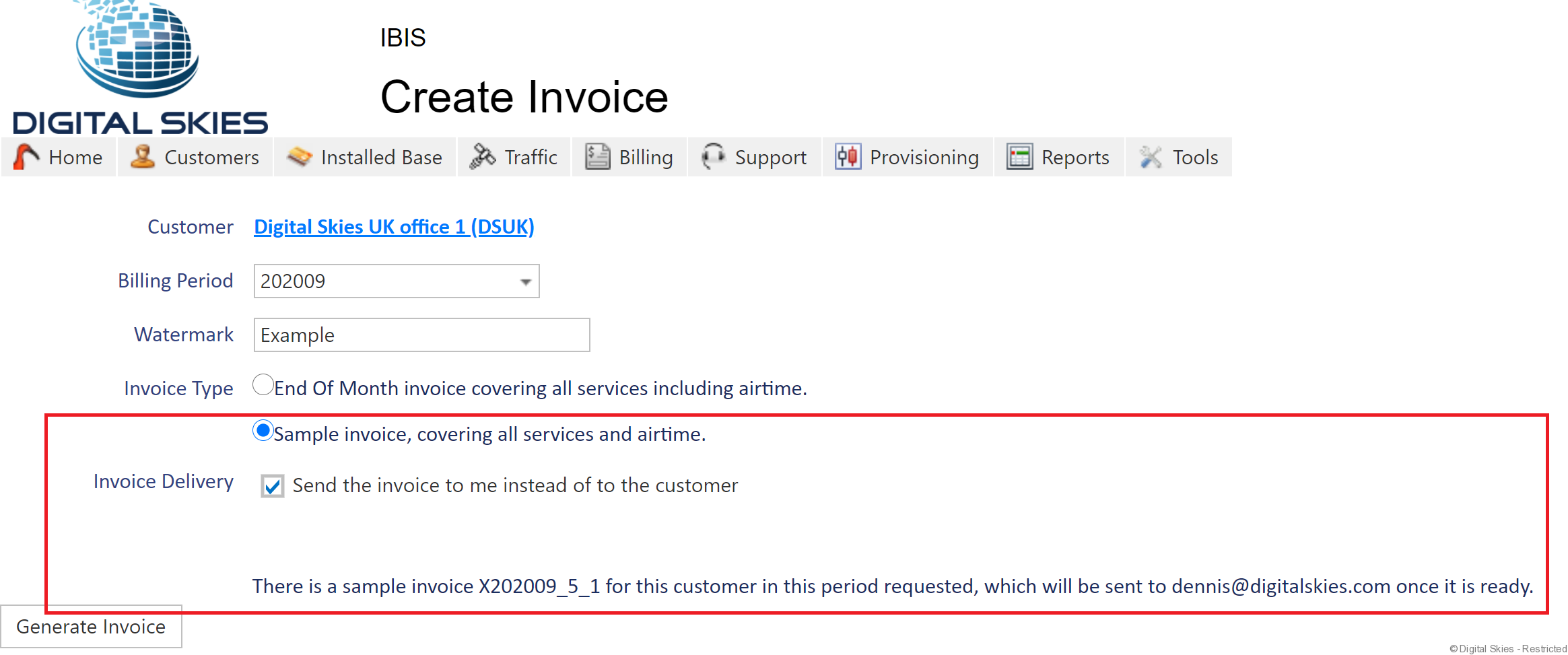 Under Invoice Type, select either, ‘End Of Month invoice’ to send the invoice to the customers billing email address or ‘Sample invoice’ to send the sample invoice to you. Please note Sample Invoice is set up as Default. If selecting the sample invoice option, the Invoice will always be sent via email to the user who requested the invoice sample and not to the customers billing email address.