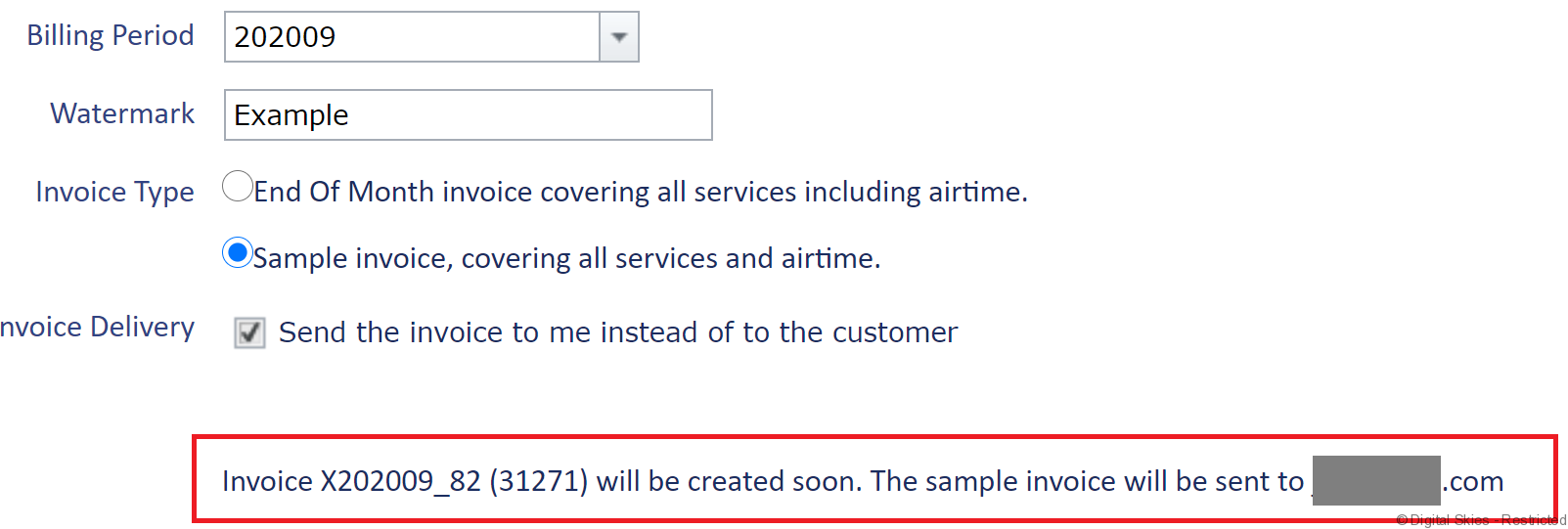 Please note, if the customer account has no airtime costs or fees to invoice then an invoice will not be generated. The user will receive an email notification to advise them of this.