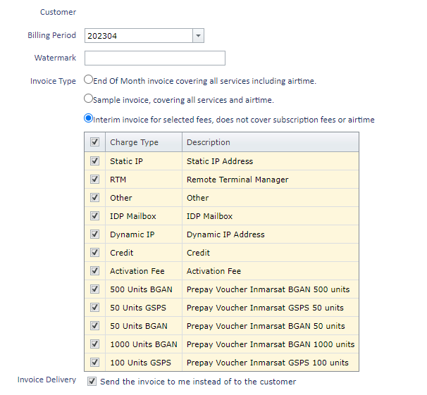Select the charge types to be included in the interim invoice, then select