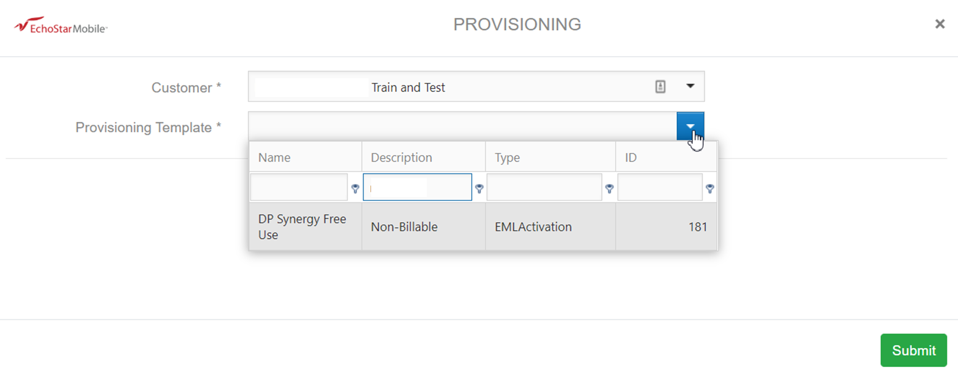 Select the price plan to activate on and click [submit] to open the next part of the wizard.