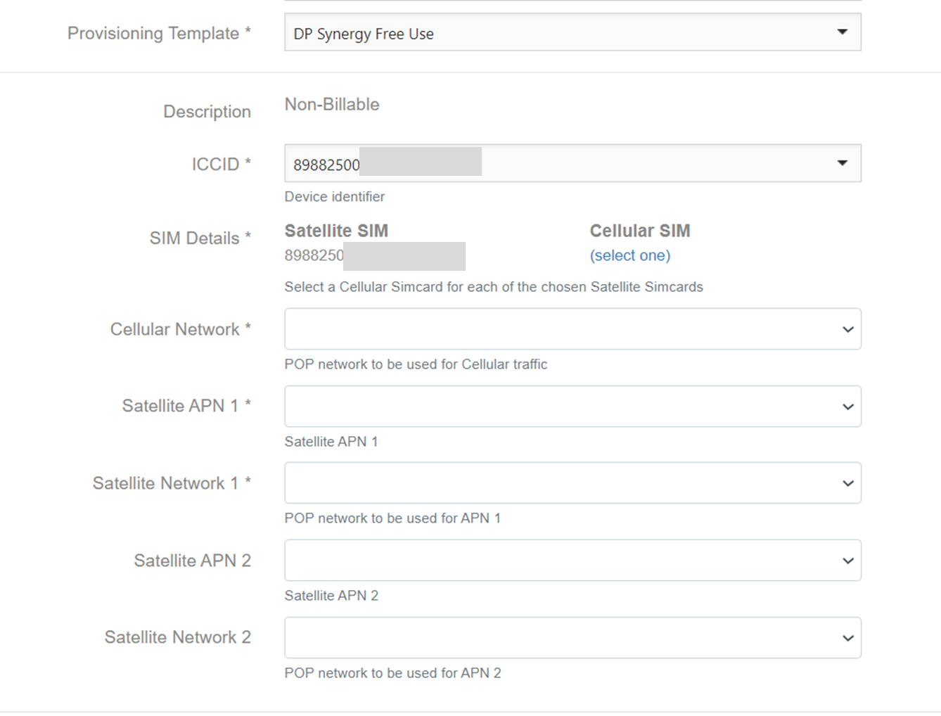 The next step is to select the cellular SIM card from the drop down box which is available next to the satellite SIM card. Please note that a Synergy activation always requires both a satellite and a cellular ICCID/