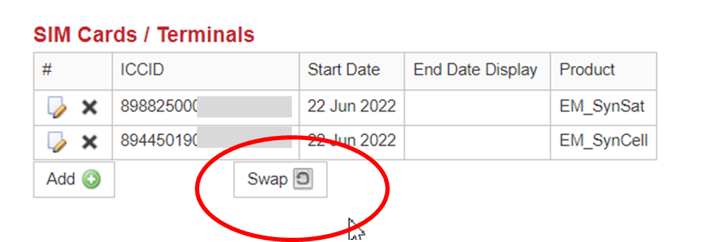 - Clicking this [swap] button will bring up a pop-up box where a different cellular SIM card can be selected.