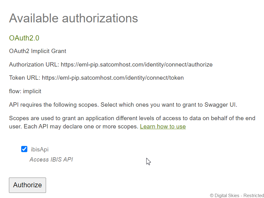 Expand the item to view by clicking on it. Important: The first time the user does this, they will see the red exclamation mark to the right. Click it, check the [ibisApi] and click Authorize. (In case the user had not already logged on to EML-PIP, this will open a new browser tab where they can pass their credentials; if they followed the steps above, they are already logged in).