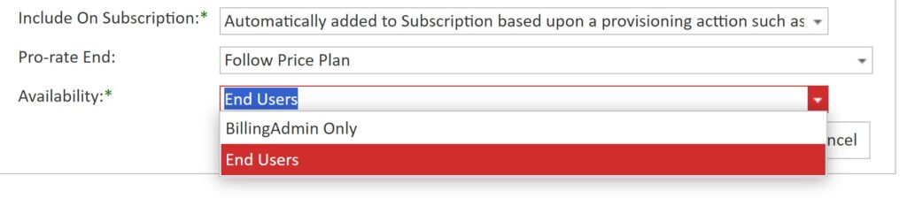 Pro-rate Start/End: Pro-rating can be set to the fee itself or follow the pro-rating of the price plan to which it belongs.