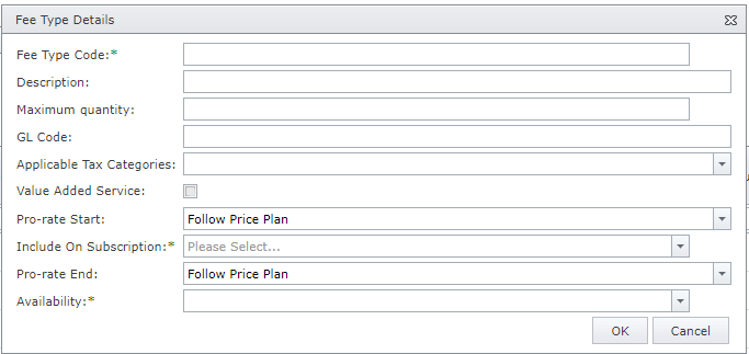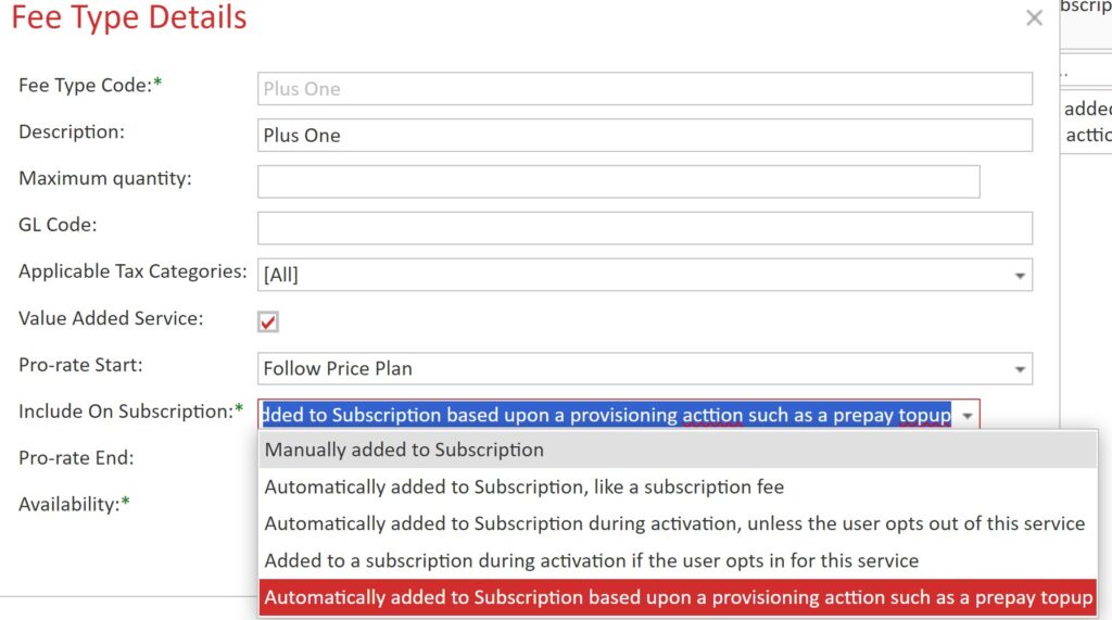 Value Added Service: Additional fees types can be defined against a price plan to capture services that are provided for each subscription. The behaviour of these fee types can be configured for pro-rating and for applicability.