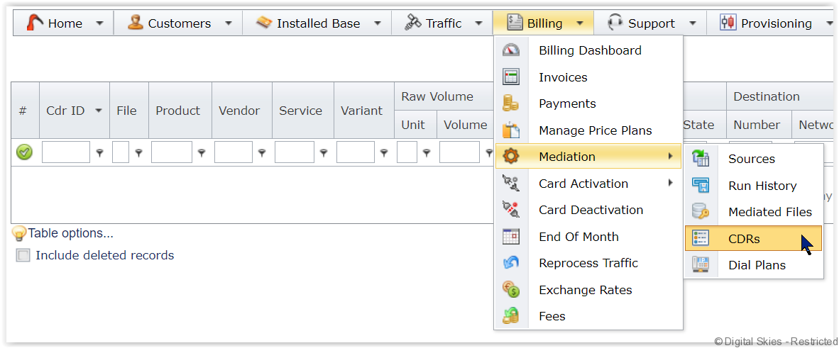 BillingAdmins can validate the CDR raw usage vs billable traffic in the unified CDRs page via [Billing], [Mediation] and [CDRs].