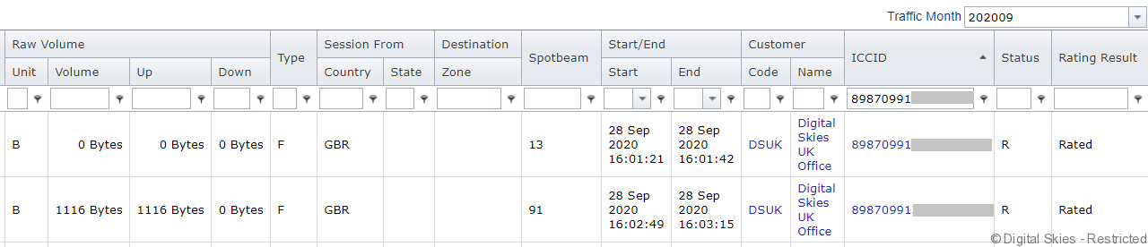 To view the raw usage for a single SIM, filter by ICCID and traffic month.