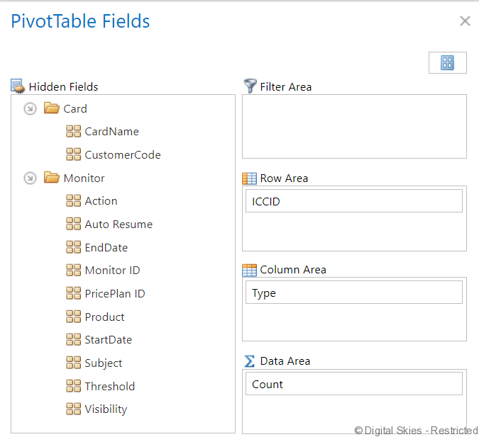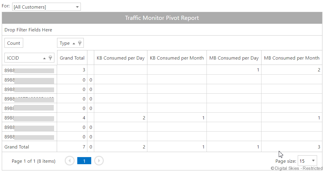 This report allows the generation of a pivot report for all elements of the traffic monitors. An example report, listing the devices with the number of monitors on it, as well as the consumption of traffic against the monitors, is shown below.