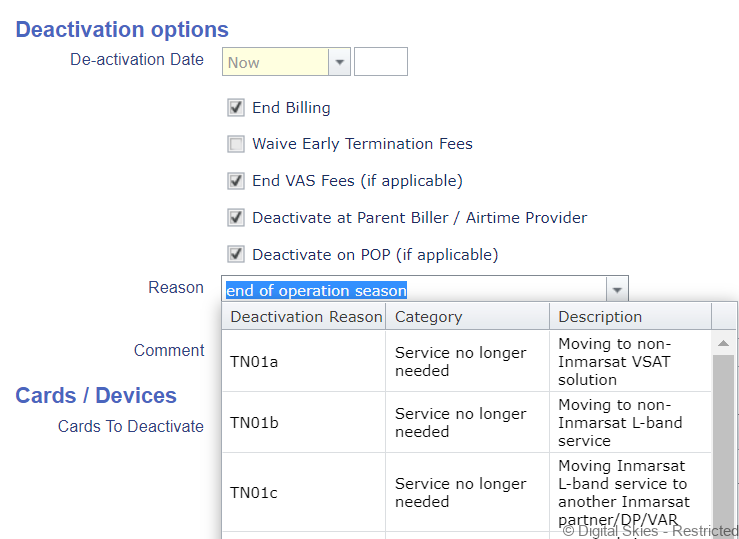 As per the first of August 2021, Inmarsat has introduced a mandatory field to the deactivation options. This field is called “Reason” and it is required to populate the field with the reason why a device is deactivated.
