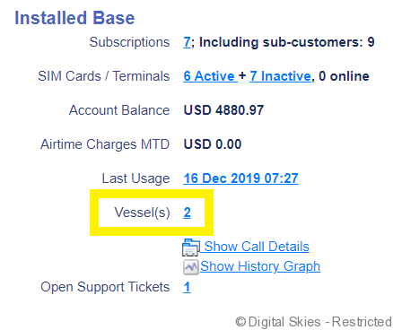 Click on the vessel name to view the details and identify any SIM cards activated against the Vessel