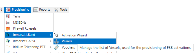 Vessel management is found under the [Provisioning] menu, scroll down to [Inmarsat L-Band] and [Vessels]