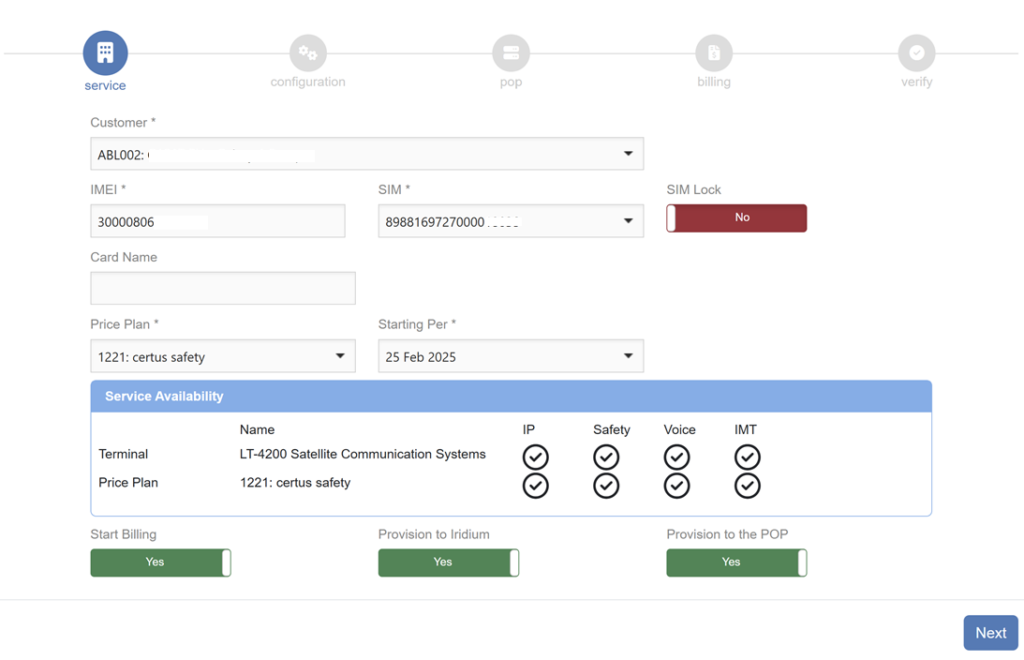 When activating a Certus SIM that supports GMDSS (recognizable by the range 8988169727…), the additional ‘Safety’ service will appear in the Service Availability overview.