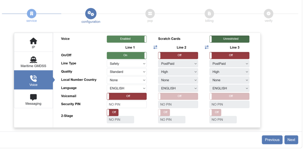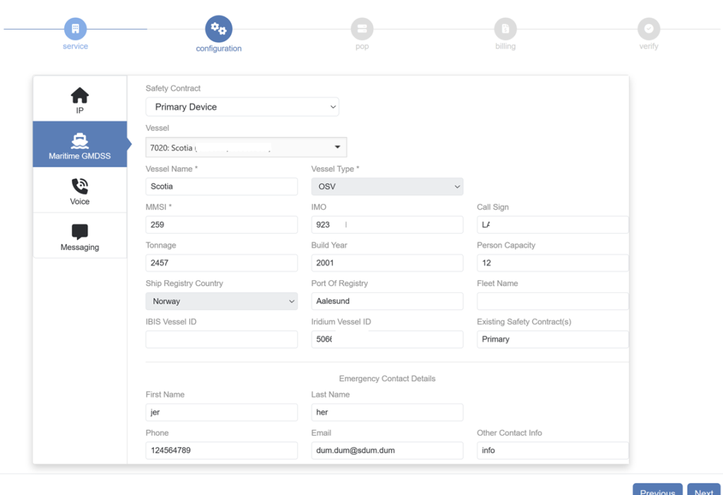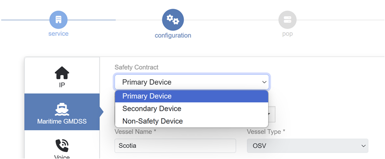 If both SIM and terminal support Safety, then the GMDSS options become available in the configuration tab. This consists of two features: The additional Safety Contract selection on the Maritime GMDSS tab and the additional Safety option on the voice line types. The vessel itself needs to match the criteria to allow a Safety contract, that is amongst some other properties mainly the emergency contact details,
