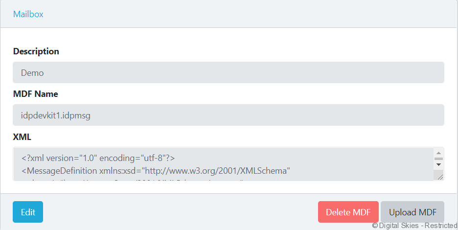 Users can view and edit the mailbox description, upload MDF files in the supported .xml or .idpmsg format or delete the MDF from the mailbox.