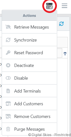 Use the action menu for mailbox interactions such as adding customers or terminals and retrieving or purging messages.