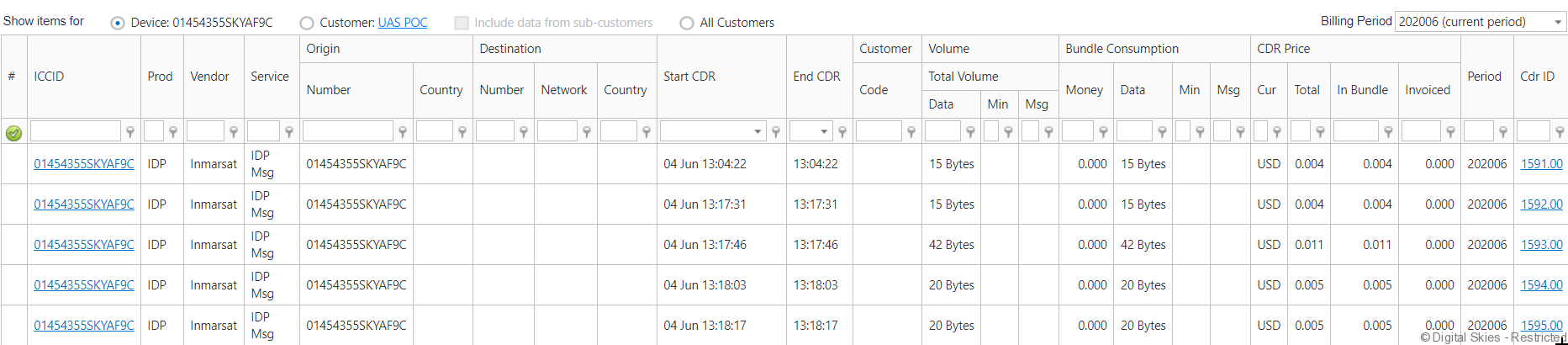 The [Cdr ID] links to the mediated CDR with reference to the raw call data from the satellite operator, see CDR mediation.