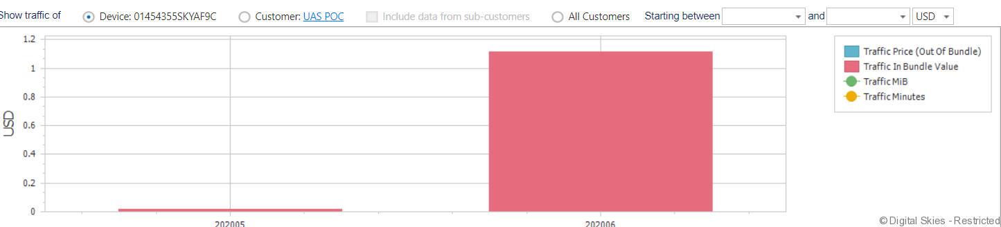 When selecting [Show History Graph] two graphs will pop up, one graph showing USD value of the traffic generated and one graph showing the volumes of traffic.
