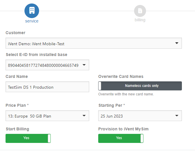 For a standard activation you will leave the options to start billing and to provision to iVent as ‘Yes’.