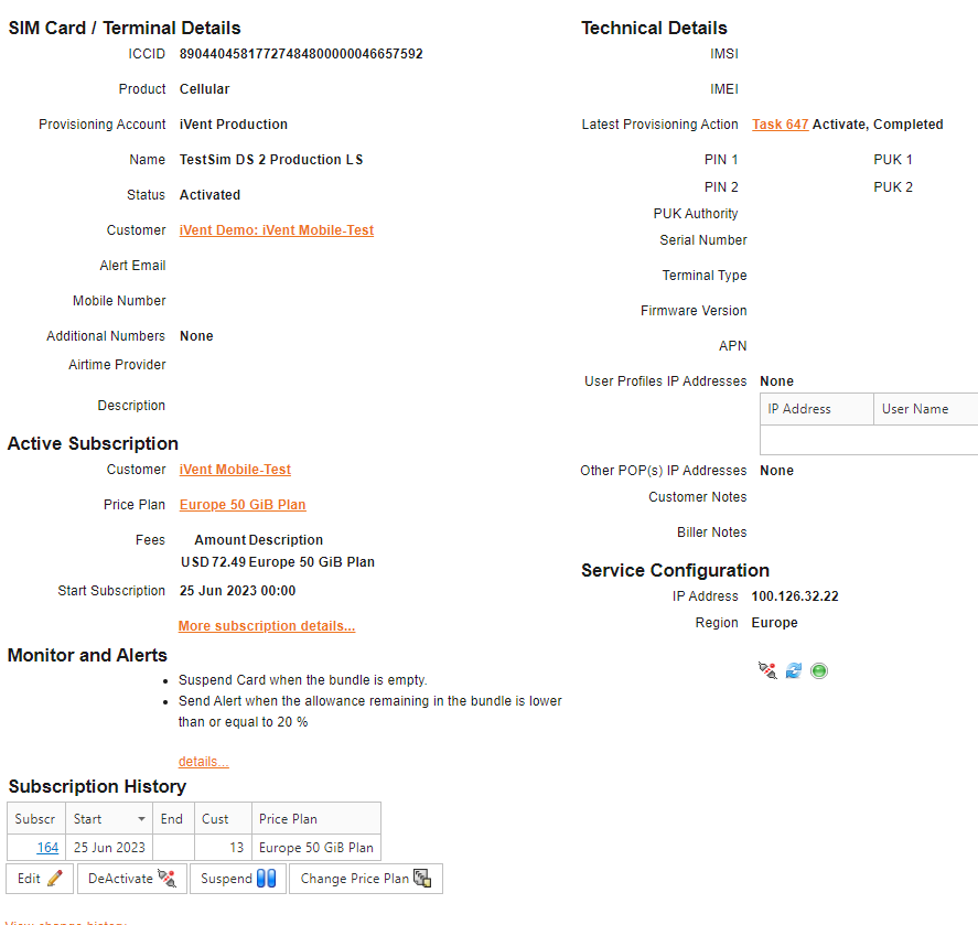 - Lists any monitors or alerts set up against the SIM/Subscription. This section can be expanded by clicking on details link. Please note that monitors on the SIM Card level can be part of the price plan as set-up by iVent, or can be added by the iVent customer.