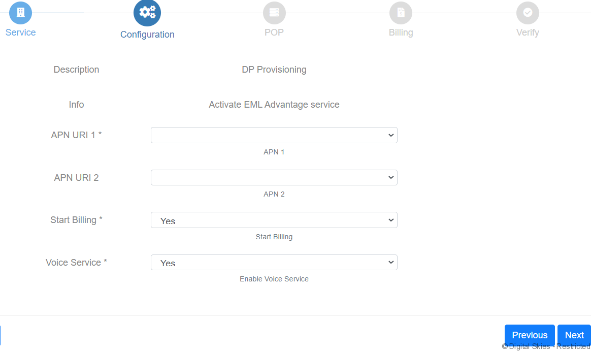 The next page is used to configure APN and voice services (Voice is only for EM Advanced, for EM Momentum this option will not appear). If a second API is required, this can be added at the moment of activation as APN URI 2.