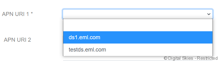 Select the APN/s required for the SIM card using the drop down list. Only EM APNs available to this customer will be visible. If only 1 APN is required, leave APN URI 2 blank.