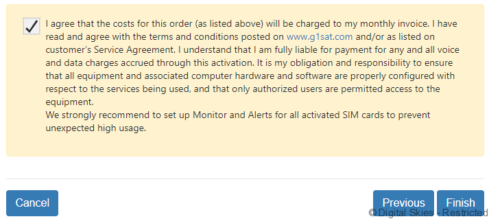 The user will be prompted to read and agree with the Terms & Conditions of the activation request before proceeding. Tick the agreement box before clicking [Finish]