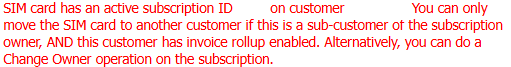 A device can be moved from one sub-customer to another sub-customer by changing the customer of the device. This is only possible if both customers are sub-customers of the same parent customer and if both have the invoice roll-up to parent enabled. Else the below error message will appear: