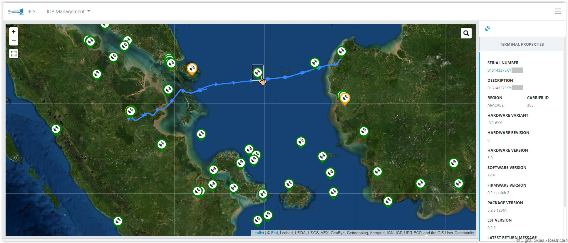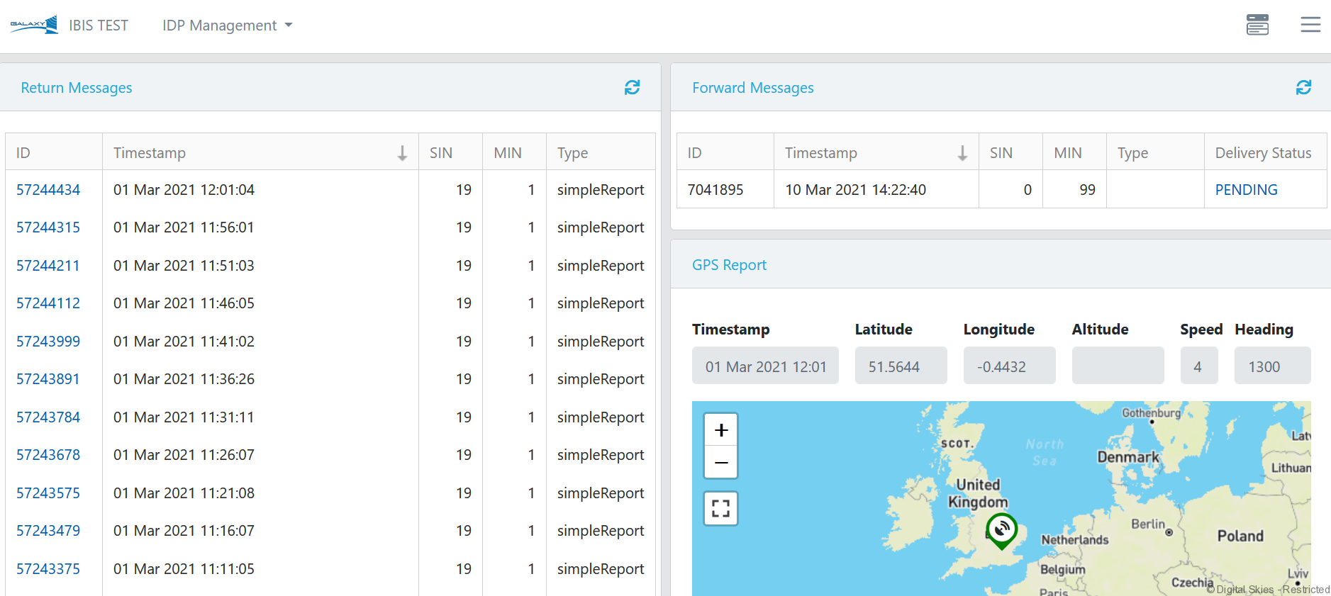 The IDP Management screen consists of a number of widgets displaying terminal details, messages, and GPS reports.