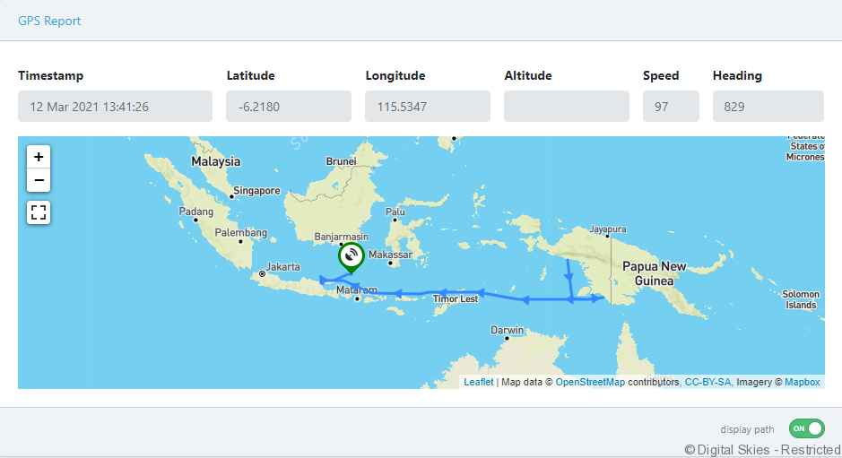 Click [Display path] on the [GPS report] widget to display the tracking based on terminal position reports and scheduled messages, provided they contain the latitude and longitude fields.