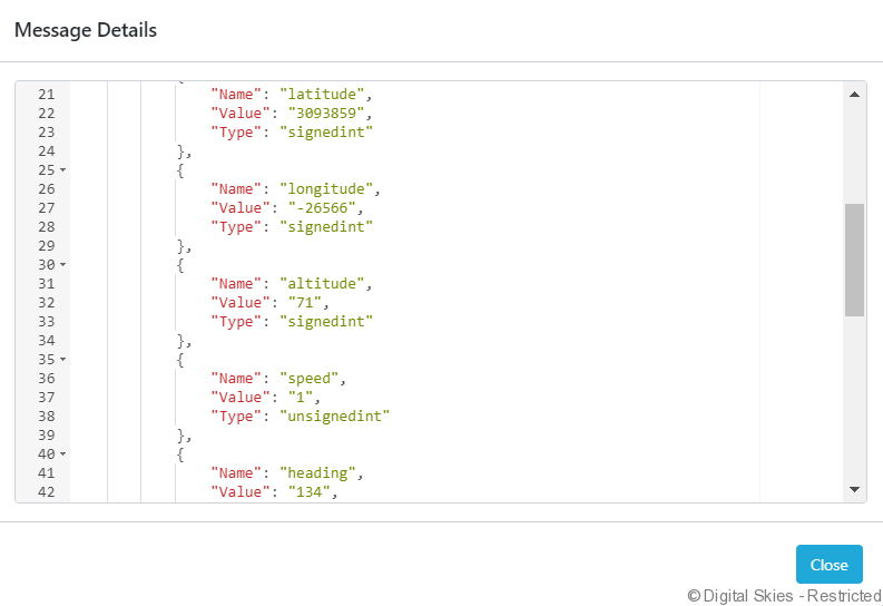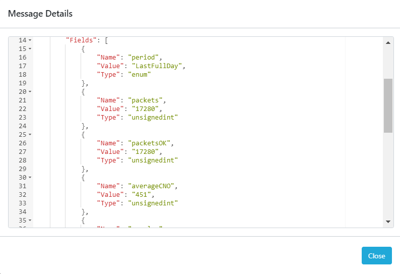 Use [Average C/No value] (carrier-to-noise-density ratio) to view the average signal strength over the requested period. Place the decimal between the second and third value to get the signal strength. In the above example, the signal strength [averageCNO] is 45.1.