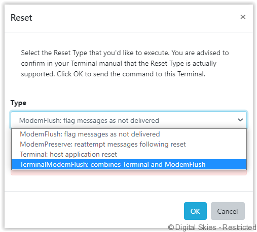 Use the [Reset] command to reset the terminal on a modem or terminal level. Users have several options to flush messages or reset the application.