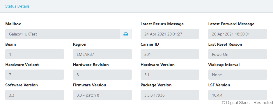 Both modem registration and request configuration messages update the relevant fields in the terminals status details widget.