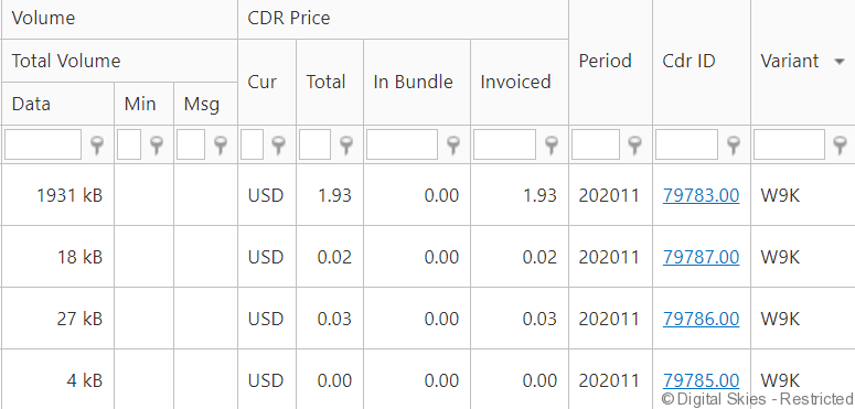As of now, the SDF traffic will be rated as per this price. Any CDRs on the error list will be automatically picked up and rated. No additional actions are required during the invoicing process. In the rated traffic overview, the Secondary Data Flow is visible in the [Variant] column.
