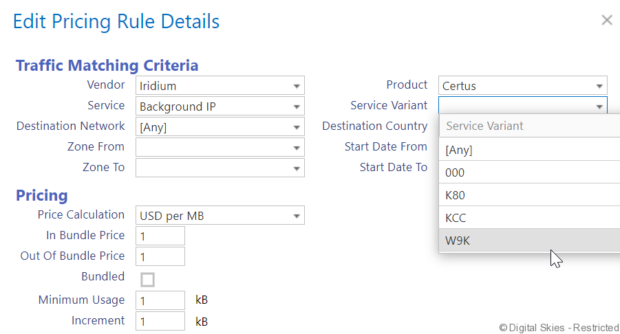 When the SDF is created on the Iridium side, it is designated a three digit code, which is used to identify the traffic so that it can be rated correctly. In the IBIS raw CDRs this field is called “unused”, but in the rated CDRs it is included in the Service Variant field. When a SDF is created, the service variant is already made available in IBIS for inclusion in price plans.