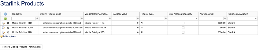 The button [Retrieve Missing Products From Starlink] will update the table with any new service plans. The Starlink Products table will have the ProductID, Starlink Product Code, Allowance and Provisioning Account columns populated.