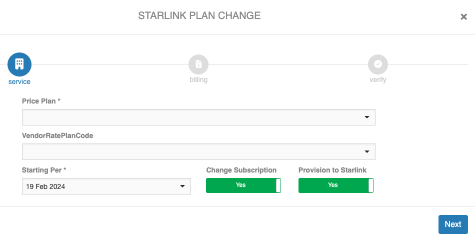 A Starlink Service Plan needs to exist to base the Price Plan upon. To set up Starlink products, navigate to: