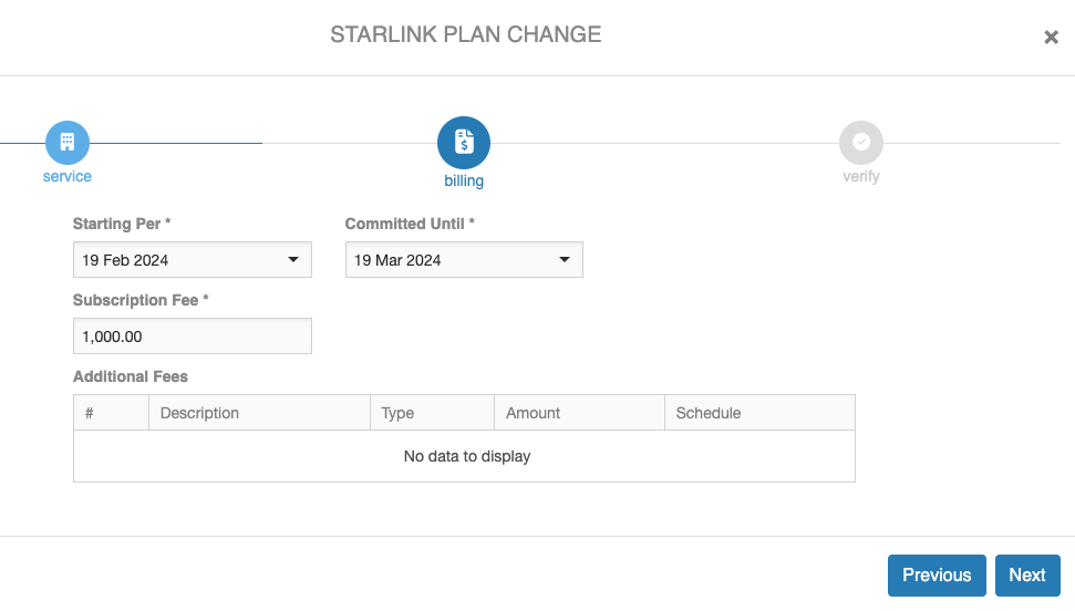 Select the Starting Per and Committed Until dates as required. Administrators may update the Subscription Fee if necessary. Click [Next].