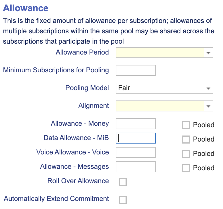 In the Allowance section choose the Allowance Period. If there are a minimum number of subscriptions needed before pooling will be allowed enter this threshold in the Minimum Subscriptions for Pooling field.