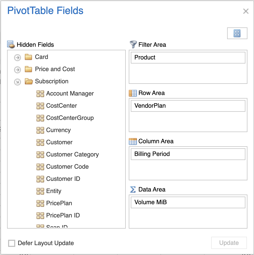 Click on the [Fields…] button to edit the pivot report. Add the VendorPlan field to the Row Area from the Subscription folder on the left. Move Product to the Filter Area and click [Update].