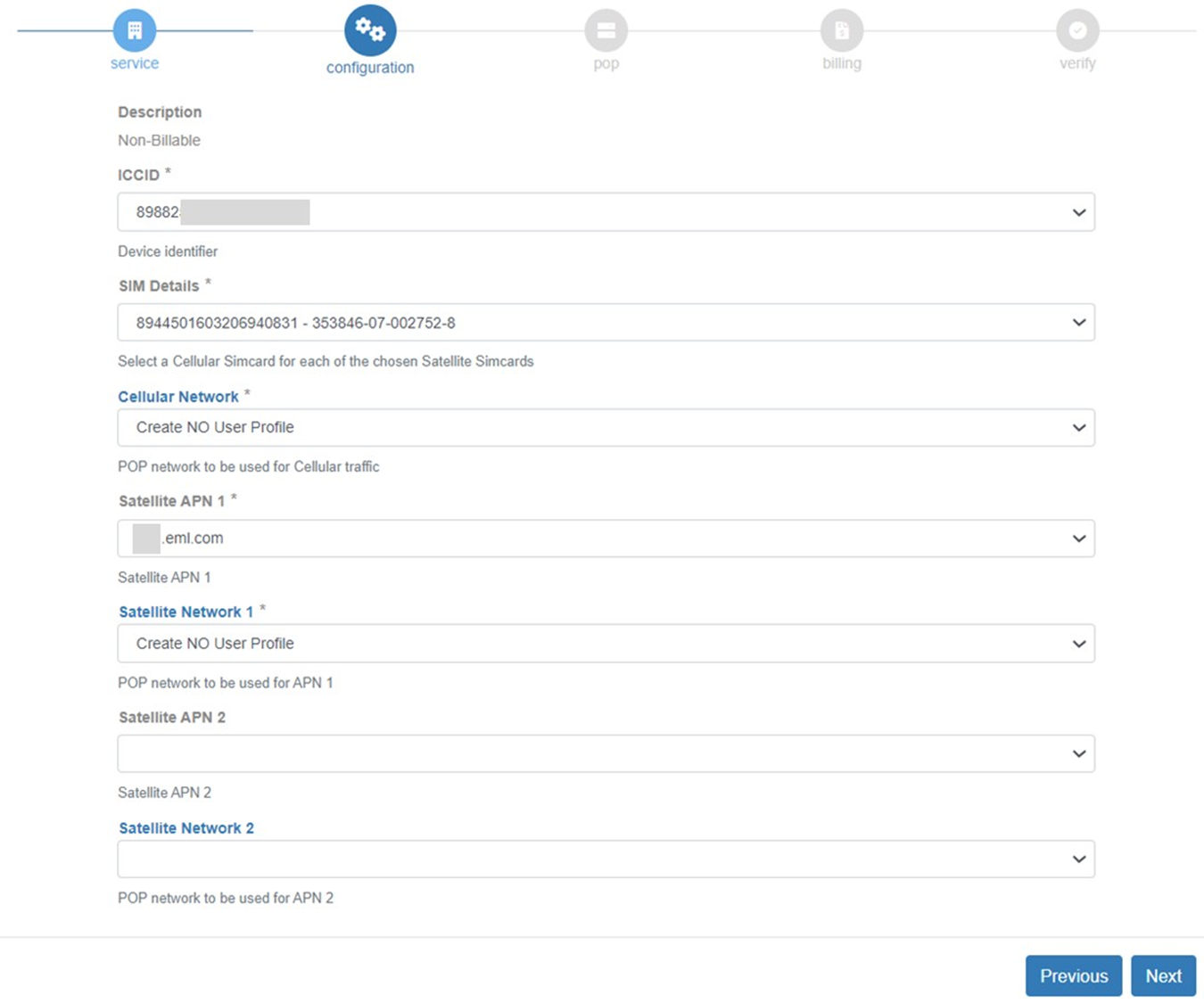 On the Configuration screen, the SynSat ICCID will auto populate but the SynSat SIMcard has to be added. On this screen, do not select to create a User Profile, as this will be done in the next (PoP) screen. Add a second APN for the SynSat SIM card if required.