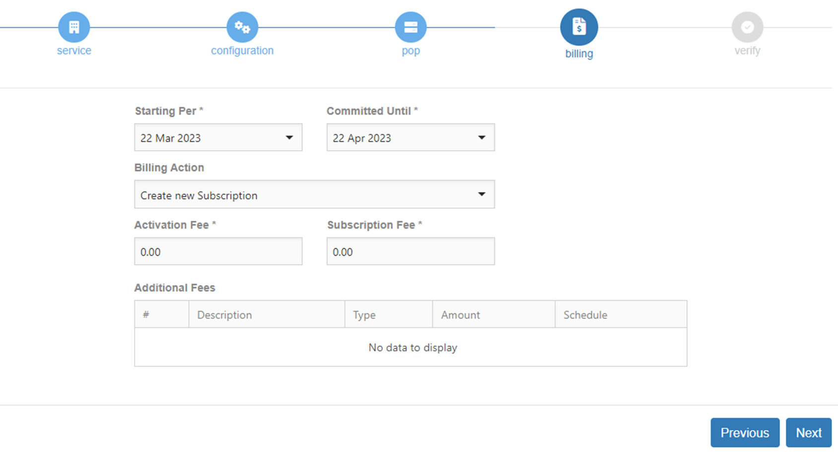 The next page is for the user to confirm the start & commitment date is correct as add any other fees that may be applicable. The Synergy subscription is a two SIM card pool, please select the option [Create new subscription] in the drop-down list.