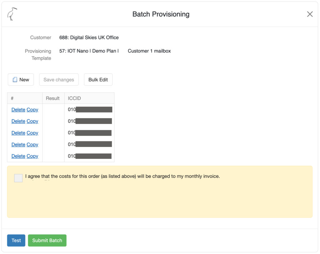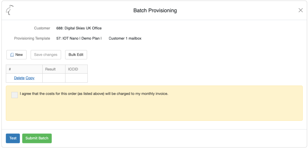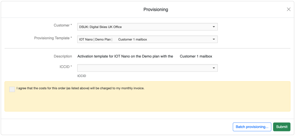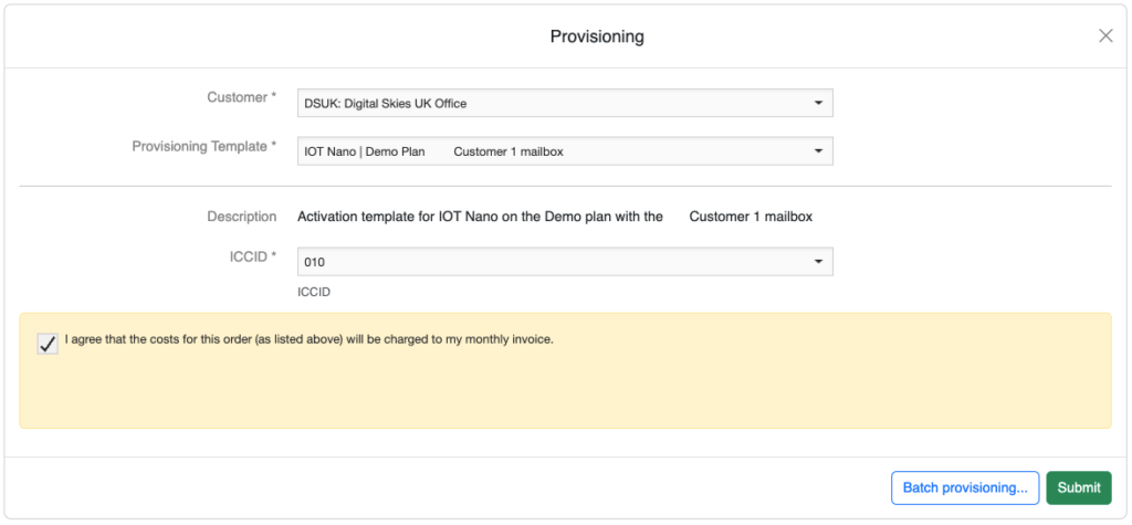 Activate multiple SIM in bulk – When a customer requests activation of multiple devices at once, this can be processed via batch provisioning in the template provisioning wizard.