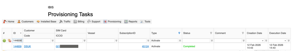 After submittal, provisioning tasks for each device will be generated. The orders are placed in a one minute processing time for each order, accommodating the time limitation process in SDP. The example above where 7 devices are placed in a batch provisioning will take 7 minutes to be processed.
