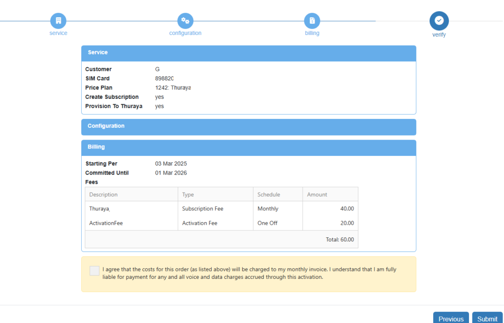 And how it appears in the confirmation page of the provisioning & billing order: