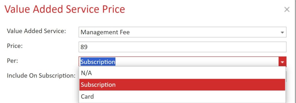 Per: Defines whether the fee should be applied per device (card), or per subscription.