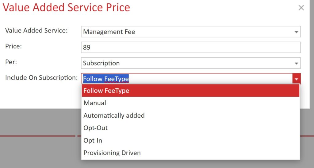 Include on subscription: In addition, on the Price Plan you can also override the default fee type behaviour for this price plan.